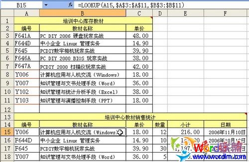 Lookup函数的对比数还可以是文本。在这张图书销售查询表中(见图2),用下表输入的“编号”(A15单元格)文本当作查询数,与上表的“编号”一列($A$3:$A$11)进行对比,查询到了匹配的文本后,将“教材名称”一列($B$3:$B$11)对应的数据提取出来。公式是“=LOOKUP(A15,$A$3:$A$11,$B$3:$B$11)”。