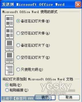 小提示:PPT导入word也可以有很多种形式。例如,选择“空行在幻灯片旁”,导出的word中,便会出现带有注释行的幻灯片缩略图形式。