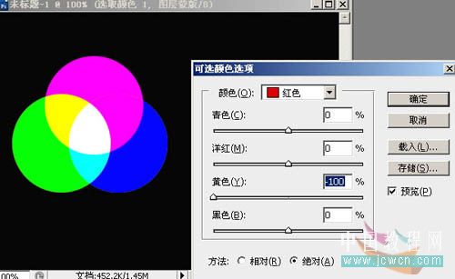 上面一张图是RGB三原色及其对应色的关系(有助于可选颜色的理解),接下来:我们在PS中画出如下图形(绿色和蓝色图层混合模式改为滤色): |