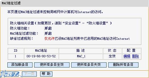 添加MAC地址:00-19-66-80-53-52,然后状态选择生效