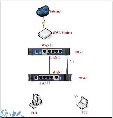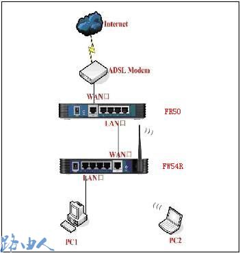 一、宽带线—ADSL MODEM—FR50(LAN口)—(LAN口)FW54R(无线)—电脑