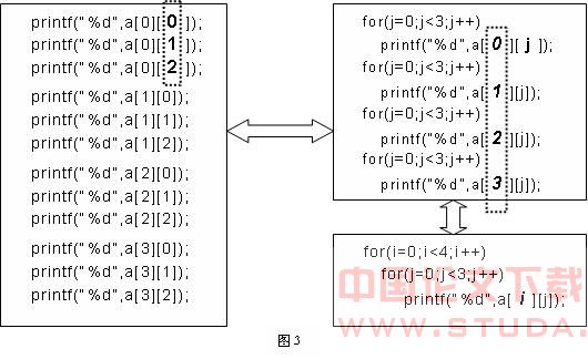 同样,对于下面这个输出二维数组元素的例子,也可以用上述办法实现,不过转换过程比上例要复杂一些:经过对比图3左侧方框中顺序结构的12条语句,可以发现也是只有数组下标在变化,但是由于是二维数组,行下标和列下标同时都在变化,很显然不能直接用一条简单的for语句来实现(不是绝对不可以实现,后面将会看到)。但是我们可以把这12条语句细分一下,3条语句为一组,而在同一组中的语句只有列下标在变化,这时可以采用上例中的方法,将列下标都用循环变量j来代替,得到图3右上的形式。再次对比图3右上的4条for语句,不同的是行下标,同样用新的循环变量i来代替,合并后得到图3右下最终二重for循环的语句。