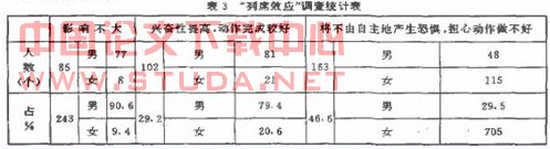 每个人部知道当众练习或比弃时心理因素对自我感觉的影响,就自己的心理活动来说,这种影响类拟子演讲家、授课者·领导者在台上向听众讲演时依脸到的那种紧张情况。从表3调查统计结菜衷明,在对待观众多和环境喧闹方面,特别我国大学体育课基本上在室外上·环境更开放,一般男生在心理上较稳定,不太领会别人愈见。而女生喜欢在观众少,且比较安辞的条件下进行练习。因此对于男生来说,观众精神上的支持.影响最一般性的.而对女生来说,这个因素是应激性的.女生大都否认观众精神上的支持是调动她们能力的盆要因紊。在承认观众形响不大的85名学生中。女生只占其中的9. 4纬。总的讲,无论男生还是女生在练习时部不喜欢旁边有其他人从表3中发现观众这个因素会使学生产生心理紧张占46,右%,故“列席效应”是非常明显的。