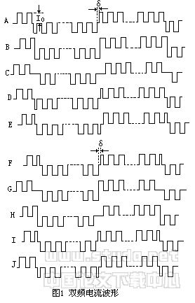 双频电流的产生是双频供电部分的核心。双频发送机首先将两种频率的方波电流合成双频电流,然后将其供入地下。何继善1981年撰文论述了各种双频电流波的合成及其特点(何继善,1981No. 6,中南矿冶学院学报)。图1是几种双频电流波形示意图。在经过理论分析和实验验证后,何继善指出,两种频率间的相位差为π、频差为奇数倍(如9倍或13倍)的那些双频电流波的波形整齐,容易产生,而且可以减少双频电流间的相互影响。另外,使用双频供电方法,不需要对电流采用稳流措施。双频观测方案可以自动消除电流变化对测量结果的影响或畸变。这不仅减轻了供电装置的重量,同时也提高了电源利用率和测量的速度,因此可以降低生产成本,且利于山区工作。对于变频法和奇次谐波法,其供电部分则必须采用稳流措施。