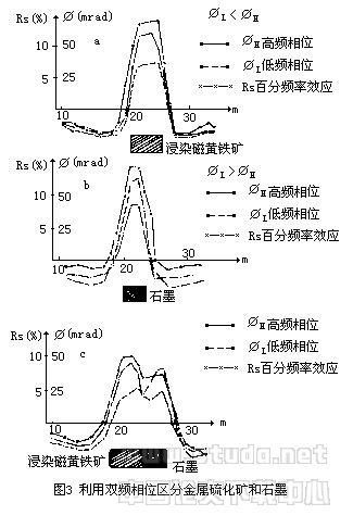 在频谱测量中,既可测量振幅谱,也可测量相位谱,通过反演求出各种视参数,换算得真参数,如时间常数等,便可评价异常源的性质。这是通常的作法。但双频道激电法可以不作这样测量,而是利用高低频率相位差的相对大小来确定地下极化体的性质。图3是一个模型实验结果。从图可见,磁黄铁矿和石墨都可引起Rs(百分频效应)异常,所以仅仅根据Rs异常不能区别二者。然而双频相位测量却能提供新的信息。在磁黄铁矿上,高频相位(φH)大于低频相位(φL);在石墨上,φL>φH,当磁黄铁矿和石墨同时存在时,这种关系仍然存在,因此利用双频相位的相对大小便可区别硫化矿物和石墨,而这是在不增加野外工作量情况下取得的。