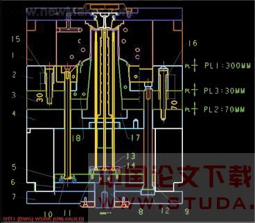 动作原理:前后模开模后,顶辊8在注塑机的推动下带动5、6号顶针板和顶针托板再推动2、3号B板和推板完成第一次顶出动作。B板2与顶针托板6由 9号推方杆连在一起。当第一次顶出到70mm时,限位螺丝16限制4号推板向前动作。3号推板继续顶出完成产品的第二次顶出。当第二次顶出到30mm时,限位螺丝15限制6号顶针托板继续向前运动。当顶针板5继续顶出时,10号推方和11号顶针同时将产品最终顶出。