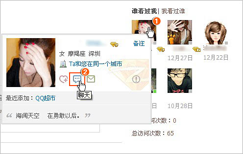 您进入QQ空间在‘个人中心’右边‘谁看过我’、‘我看过谁’中将鼠标放在好友的头像上,会弹出该好友的信息资料框,然后点击‘聊天’图标,如图所示:(注:发起临时会话前需要您在电脑上先登录QQ。)