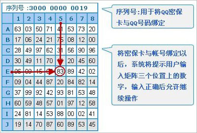 例如:上面这张密保卡序列号是:300000000019,坐标E5对应的数字是83。